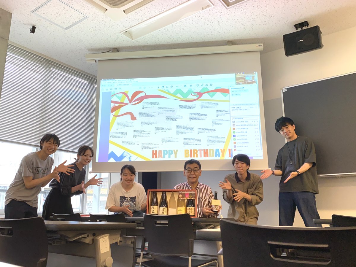今年も研究室ゼミは毎週火曜日の午後にハイブリッドで開催しており、オンラインでの参加者が多いですが、芝浦キャンパス306教室をメイン会場としており、毎週数名は教室にて参加しています。なんと本日のゼミ終了後に、画面にメッセージが現れて、サプライズで誕生日を祝っていただきました。前日(6/28)が誕生日でしたので、本当に驚き、うれしかったです! いただいた各賞受賞焼酎セットは毎晩の飲み比べが楽しみです。なによりも研究室メンバー全員ひとりひとりからメッセージをいただき、心に沁みました。ありがとう!